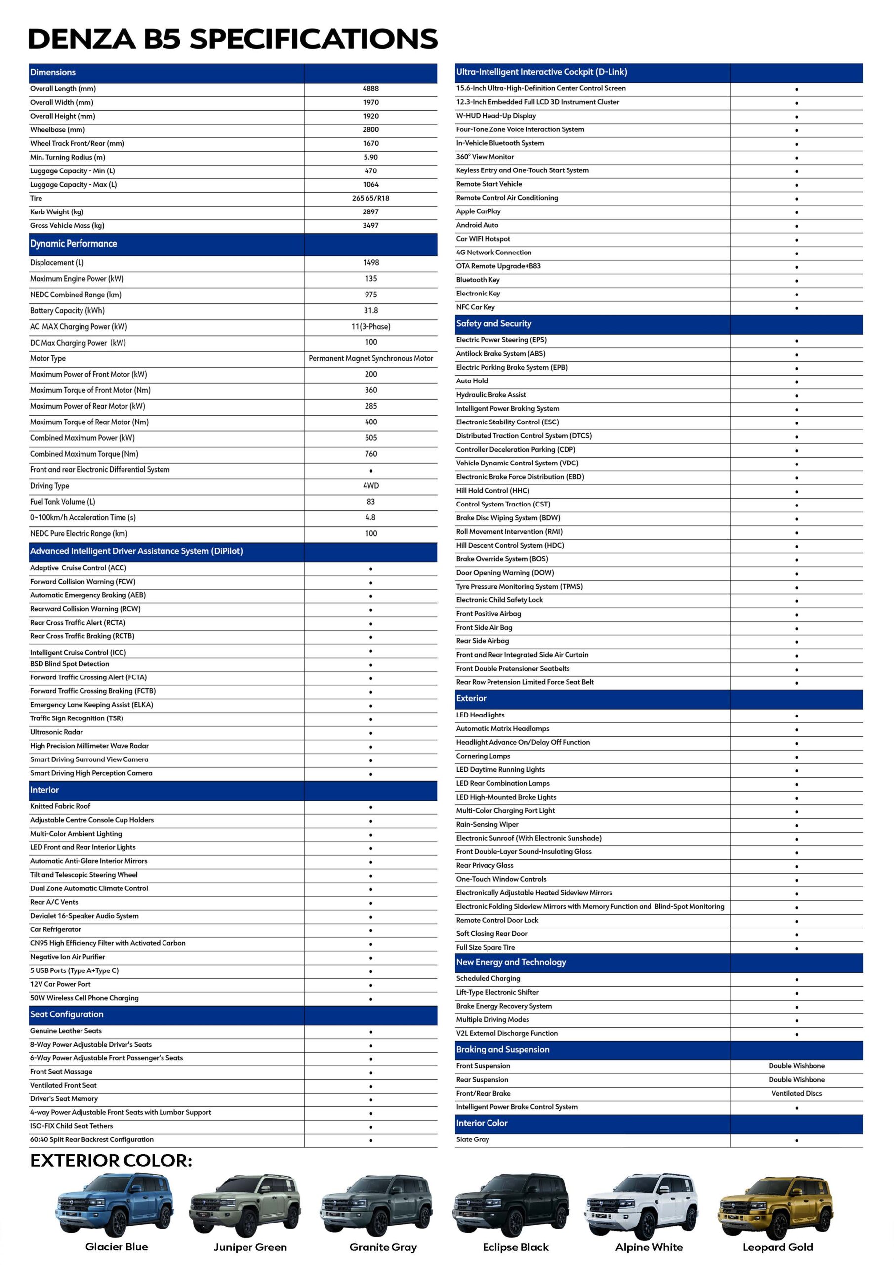 DENZA B5 Specifications